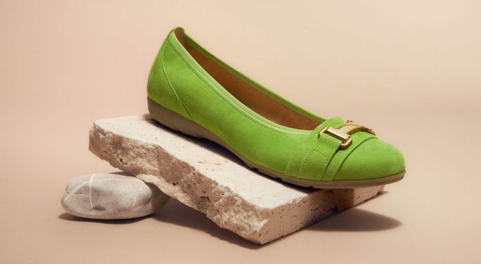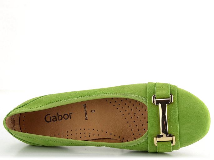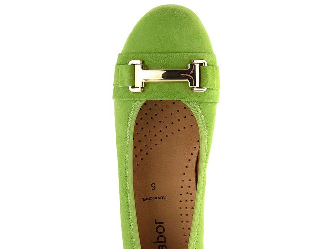 Vysoce komfortní dámské baleríny od značky Gabor jsou ideální volbou pro jarní a letní sezónu. Tyto baleríny nabízejí kulatou špičku a pohodlný střih, který oceníte při každodenním nošení. Svrchní materiál je vyroben z jemné semišové kůže v sytém odstínu světle zelené barvy, která dodá vašemu outfitu svěžest. Kovová aplikace ve zlaté barvě na špičce dodává balerínám elegantní vzhled.