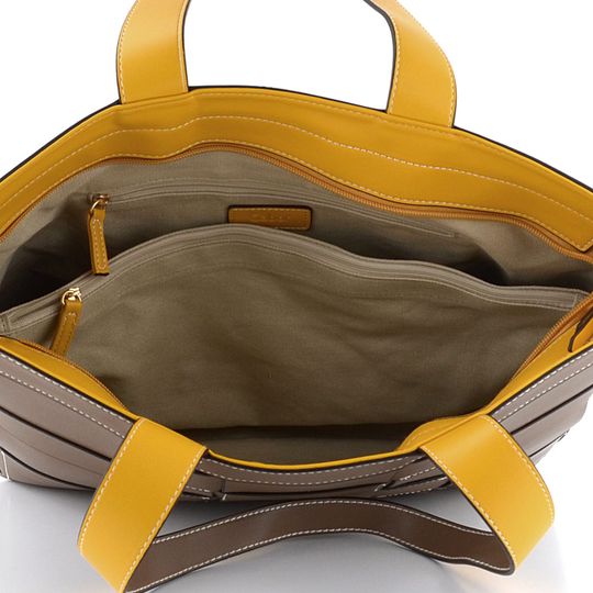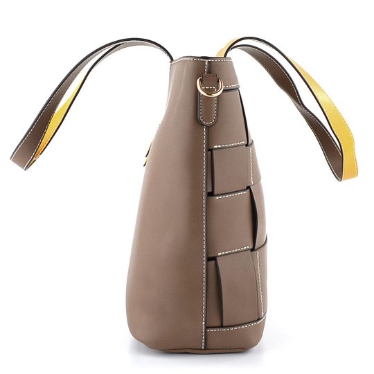 Dámská módní shopper kabelka v prostorném střihu a se zajímavým proplétáním na přední straně.