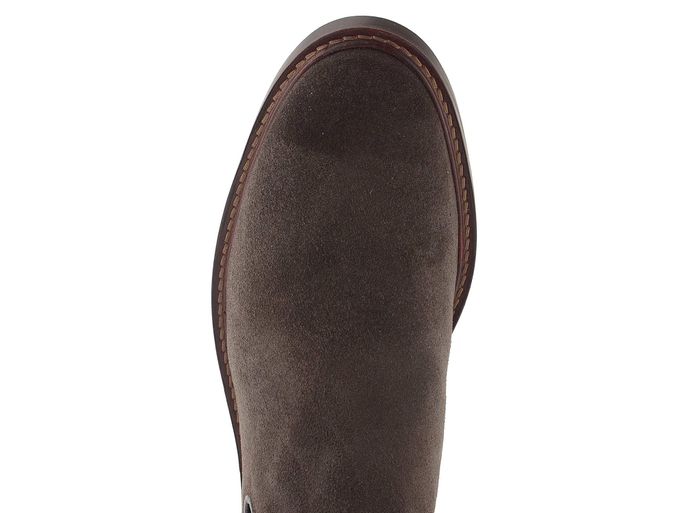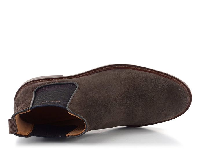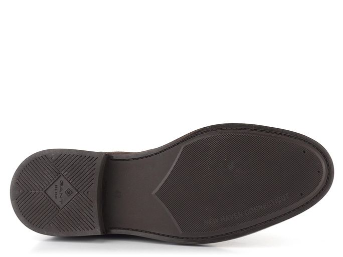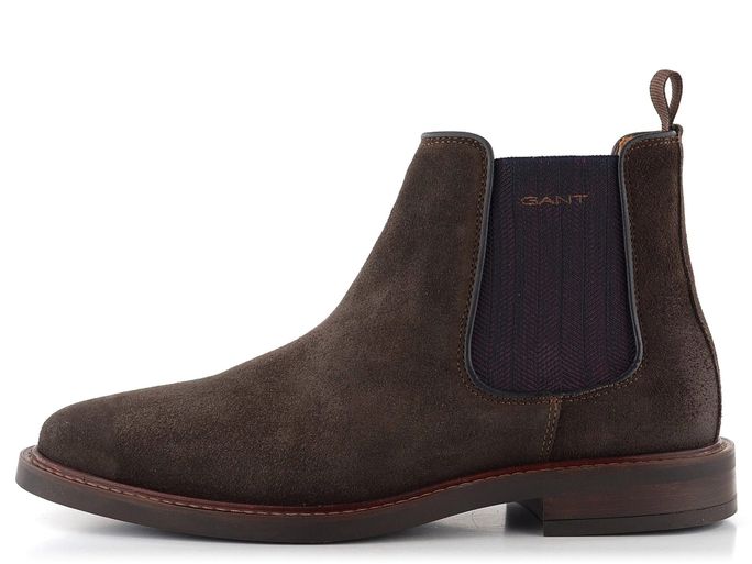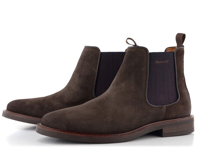 Šmrncovní pánské „pérko“ od značky Gant je ideální volbou pro podzimní a zimní sezónu. Tento prozouvací model s užší kulatou špičkou je vyroben ze semišové kůže v tmavě hnědé barvě. Na obou stranách jsou všité široké pruženky s vytlačovaným dezénem rybí kosti v tmavé bordó barvě, což dodává botám stylový vzhled. Uvnitř najdete celokoženou podšívku a extra měkkou koženou stélku, která zaručuje komfort při každodenním nošení. Bytelná podešev s jemným vzorkem a širokým podpatkem poskytuje stabilitu a odolnost. Výška kotníku je 13 cm, měřeno bez podešve po hranu pruženky. Vzadu je všité stylové poutko s logem značky, které usnadňuje obouvání. Tento model je vyroben lepeným způsobem, což zajišťuje jeho dlouhou životnost a kvalitu.