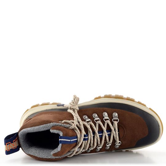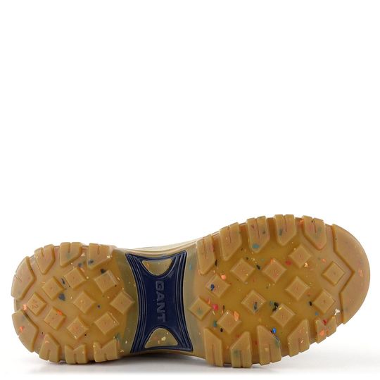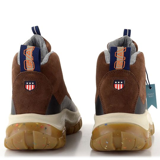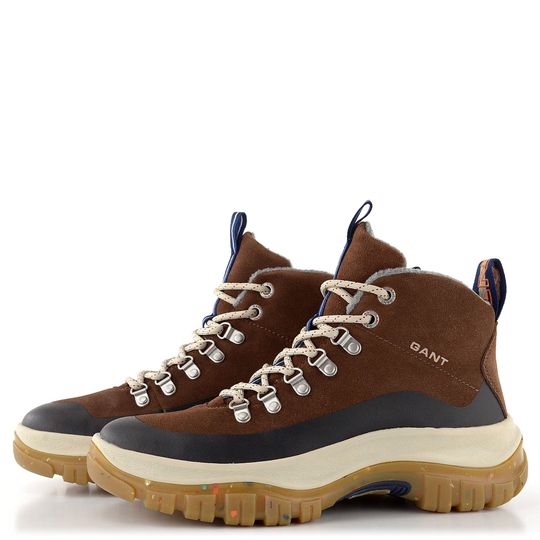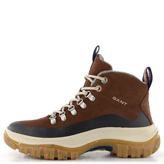 Objevte robustní pánský kotník v pohorkovém střihu od značky Gant. Tento model z kolekce pro podzim a zimu 2022/23 je ideální volbou pro muže, kteří hledají pohodlí a styl. Svršek je vyroben ze semišové kůže s ochrannou gumovou vrstvou na spodním okraji, což zajišťuje dlouhou životnost a odolnost. Boty mají prostornou kulatou špičku a čokoládově hnědou barvu s tmavě modrými doplňky a světlými tkaničkami, které dodávají moderní vzhled.