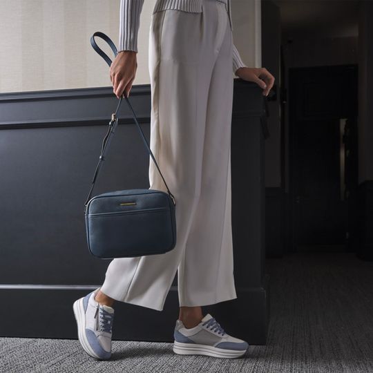 Elegantní dámská crossbody kabelka od italské značky Geox je ideální volbou pro každodenní použití v městském prostředí. Tento model vyniká svým menším střihem, který je perfektní na všechny nezbytnosti, které potřebujete mít po ruce. Kabelka je vyrobena z pevné syntetiky s jemnou strukturou a přichází v krásném denimově modrém odstínu, který snadno sladíte s každým outfitem. Zlaté kování dodává kabelce nádech luxusu.
