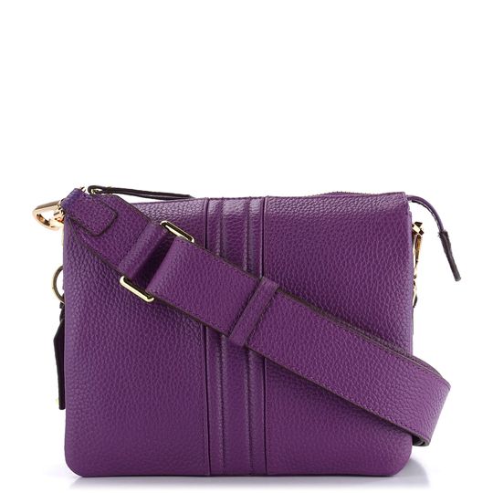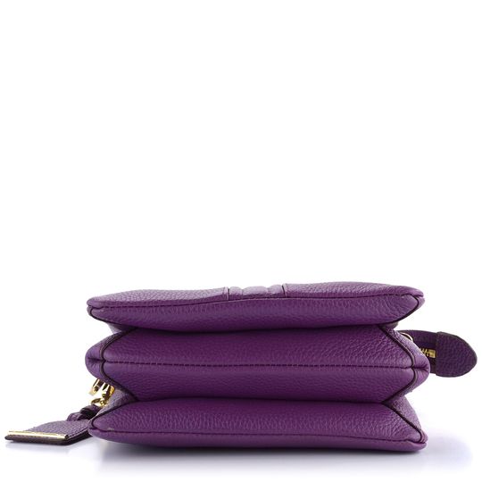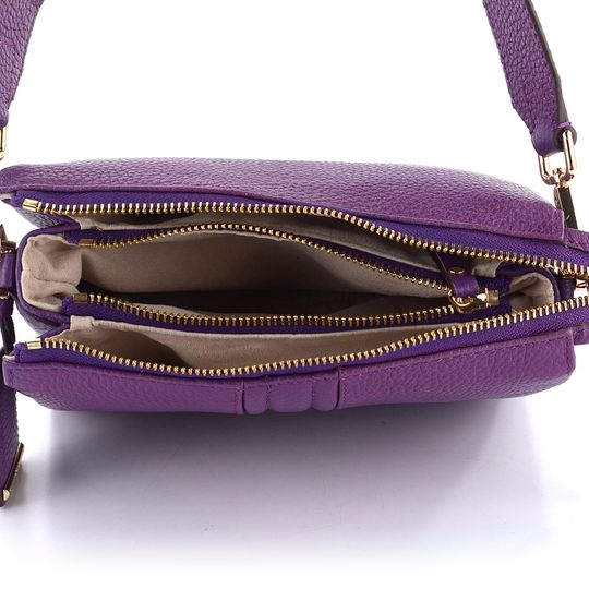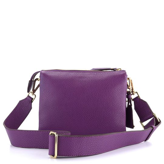 Menší kožená crossbody kabelka ve fialové barvě s kovovými doplňky ve zlatém odstínu.
