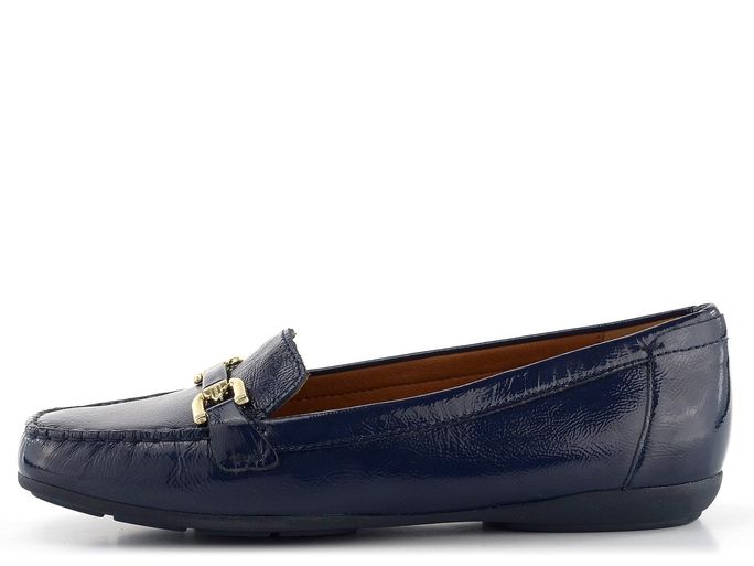 Elegantní a pohodlné dámské mokasíny od italské značky Geox jsou ideální volbou pro každou příležitost. Vyrobené z jemně mačkané lakované kůže v tmavě modré barvě, tyto mokasíny zaujmou svým klasickým designem a karé špičkou. Nárt zdobí pásek s kováním ve zlaté barvě, což dodává obuvi sofistikovaný vzhled.