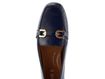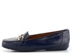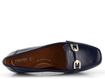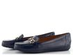 Dámské mokasíny z lakované kůže v tmavě modré barvě s ozdobným kováním na nártu.