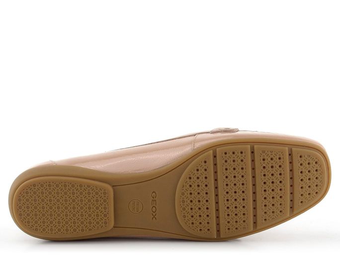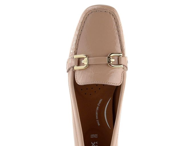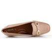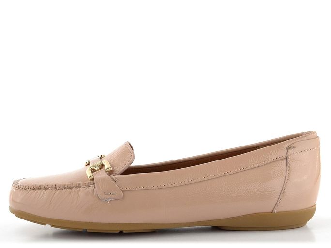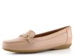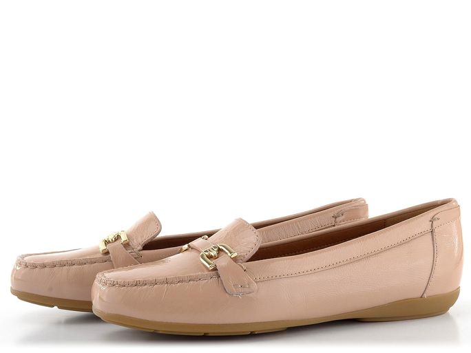 Dámské mokasíny z lakované kůže v béžové barvě s ozdobným kováním na nártu.