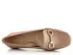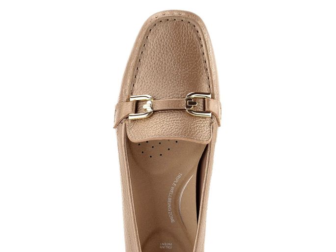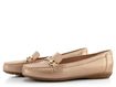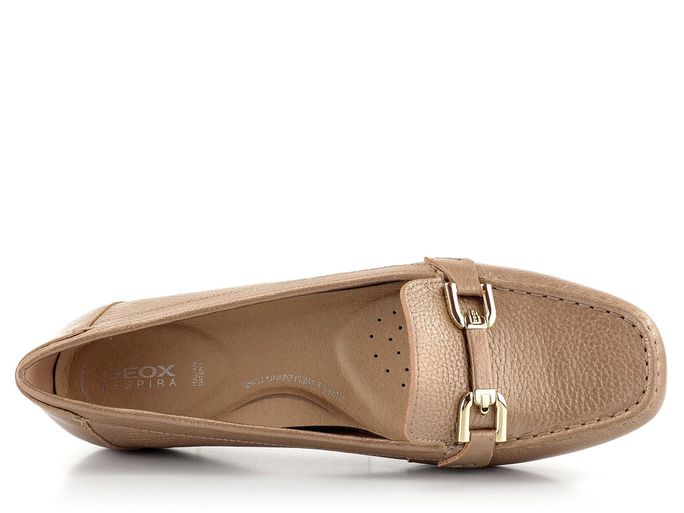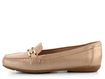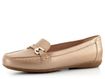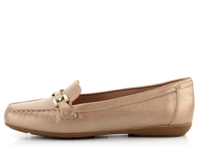 Jednoduché dámské kožené mokasíny v bronzovém odstínu s perleťovým leskem a se zlatými doplňky.