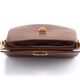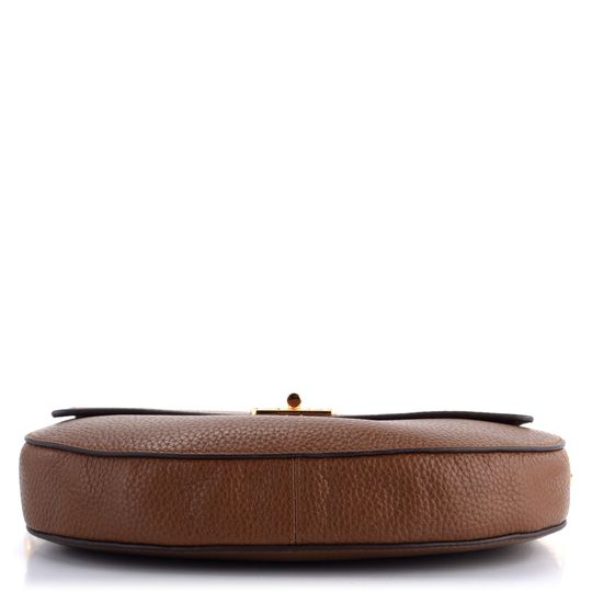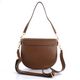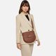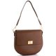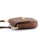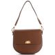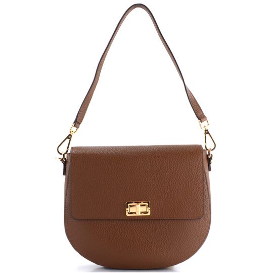 Menší kožená kabelka v hnědé barvě s klopnou na kovový otočný mechanismus a se dvěma odepínatelnými popruhy.