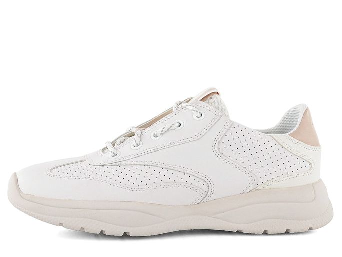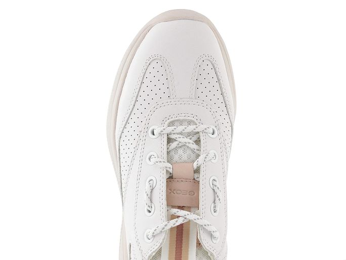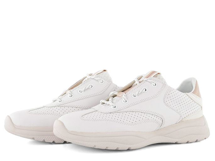 Decentní dámské sportovně střižené tenisky v odražené bílé barvě s jemnými doplňky v pudrové barvě.