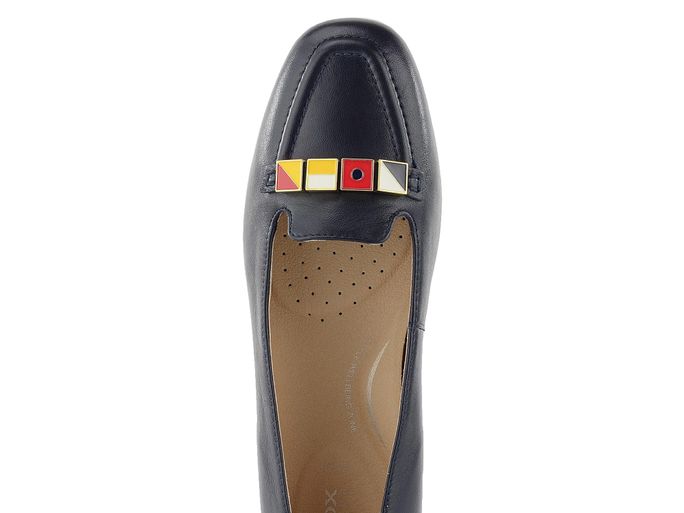 Dámské elegantní baleríny od značky Geox, které zaujmou svým italským šmrncem a módností. Tyto boty vynikají svým jednoduchým, prostorným střihem a jsou vyrobeny z hladké kůže v tmavě modré barvě. Na špičce je umístěna zajímavá barevná ozdoba, která přidává botám na originalitě. Uvnitř najdete syntetickou podšívku a anatomicky tvarovanou stélku s podporou podélné nožní klenby, změkčenou patou a vyměkčenou přední částí s perforací (Triple Wellbeing Zone). Podešev s technologií Geox Respira® zajišťuje prodyšnost a komfort. S výškou podpatku 1,7 cm jsou tyto baleríny ideální volbou pro každodenní nošení, ať už do kanceláře, na procházku městem nebo k formálním příležitostem. Obuv je vyrobena lepeným výrobním způsobem, což zaručuje její dlouhou životnost a kvalitu.