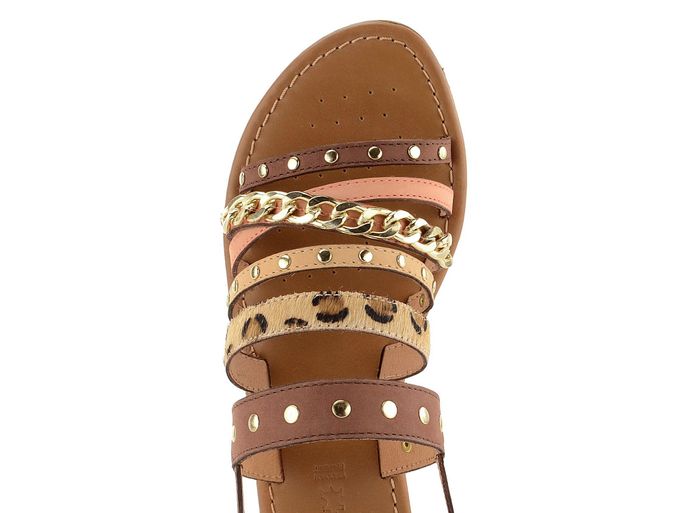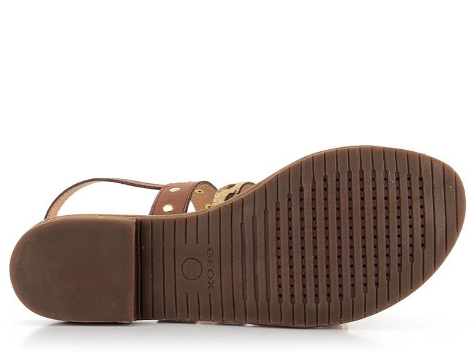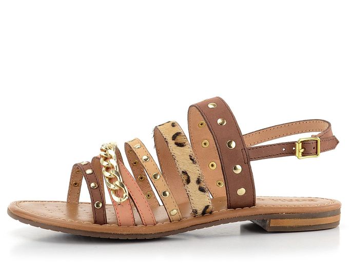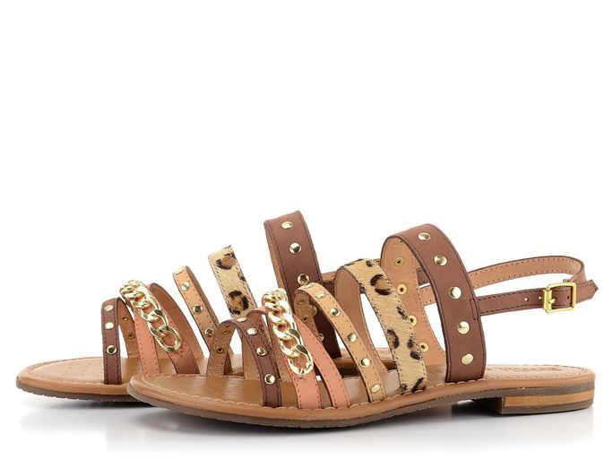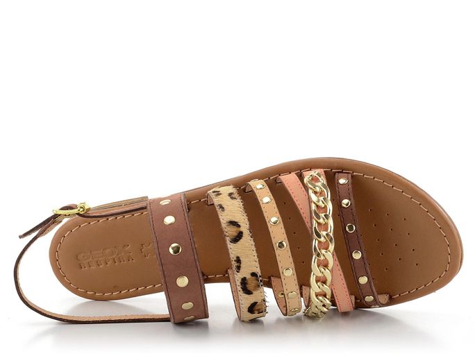 Dámské sandály od italské značky Geox jsou ideálním společníkem pro letní dny. Tyto sandály spojují eleganci, módní vzhled a funkčnost. Decentní střih a kombinace hnědé a růžové (lososové) barvy s leopardím vzorem dodávají botám jedinečný vzhled. Sandály jsou vyrobeny z kvalitní zabroušené a vlasové kůže, což zaručuje pohodlí a dlouhou životnost. Řetízek a drobné nýtky ve zlaté barvě přidávají botám šmrnc. Měkká kožená stélka s perforací v přední části a patentovaná perforovaná podešev Geox Respira® zajišťují maximální komfort a prodyšnost. Patní pásek s regulací a všitou pruženkou umožňuje perfektní přizpůsobení. Tyto sandály jsou ideální volbou pro každou ženu, která hledá stylovou a komfortní obuv na jaro a léto.