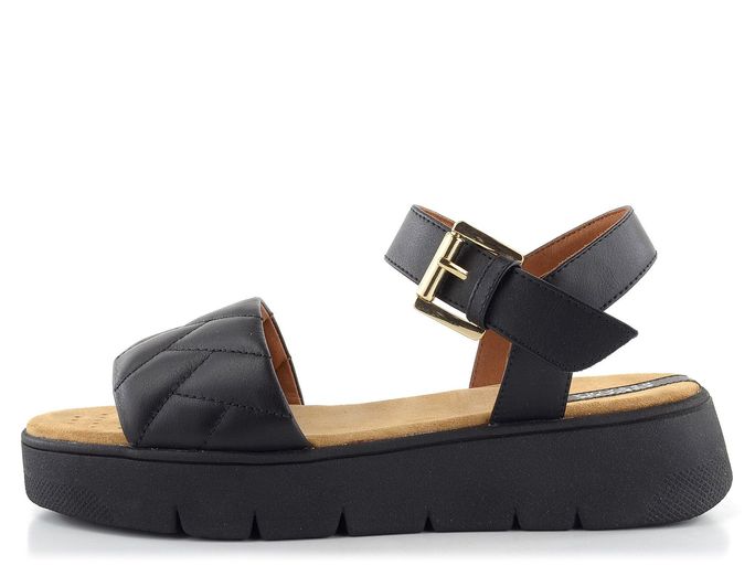 Dámské sandály na platformě od italské značky Geox kombinují moderní design s maximálním pohodlím. Jsou ideální volbou pro městské prostředí i lehké procházky. Sandály mají kulatý střih a jsou vyrobeny z kvalitní kůže a syntetiky. Černá barva a prošívaný přední pásek dodávají sandálům elegantní vzhled. Podšívka je syntetická, stélka je lehce měkčená a semišová s perforací pro lepší prodyšnost.