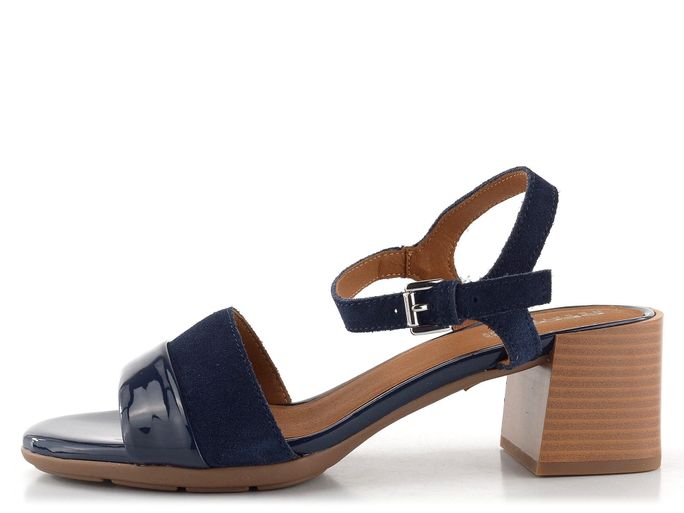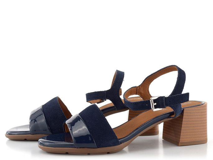 Pro ženy, které hledají kombinaci elegance a pohodlí, jsou tu dámské módní sandály na podpatku od značky Geox. Tyto sandály v tmavě modré barvě jsou vyrobeny z kvalitní semišové kůže a lakované syntetiky, což jim dodává stylový vzhled. S jejich kulatým střihem a špalkovitým podpatkem o výšce 5,5 cm budete vypadat elegantně při každé příležitosti.