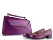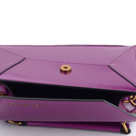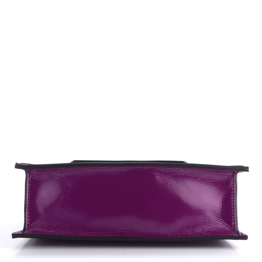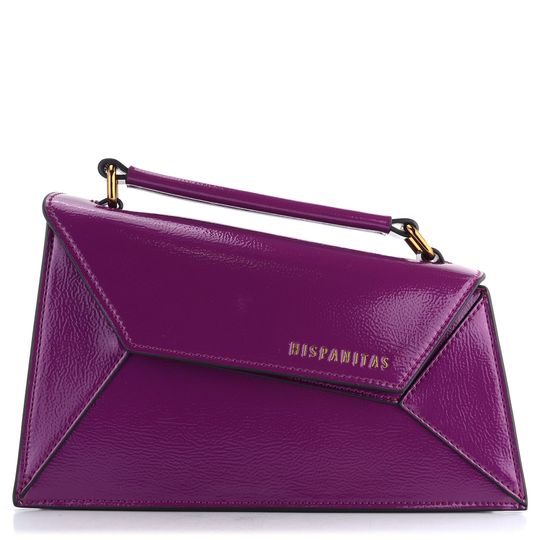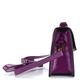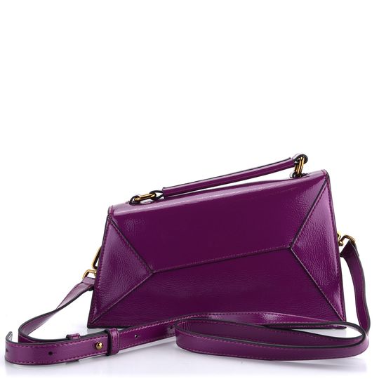 Luxusní dámská kabelka v asymetrickém střihu psaníčka a lakovaném fialovém provedení, s odepínatelným crossbody popruhem.