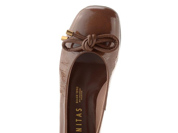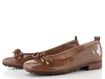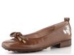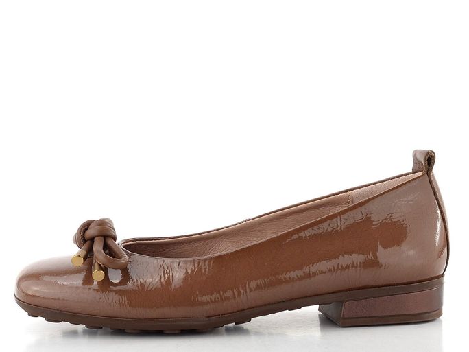Dámské baleríny v hnědé barvě z mačkané lakované kůže, doplněné ozdobnou mašličkou na špičce.