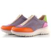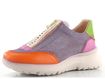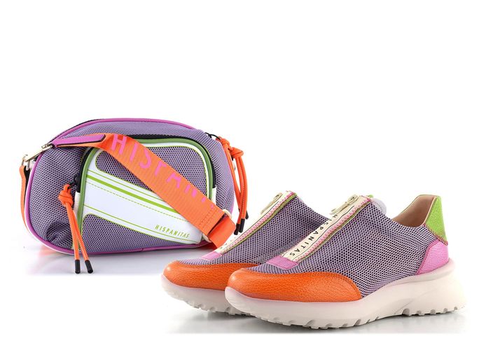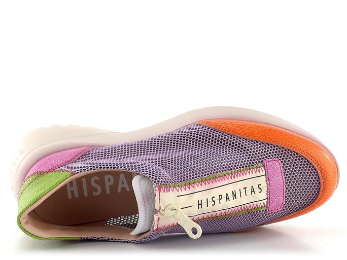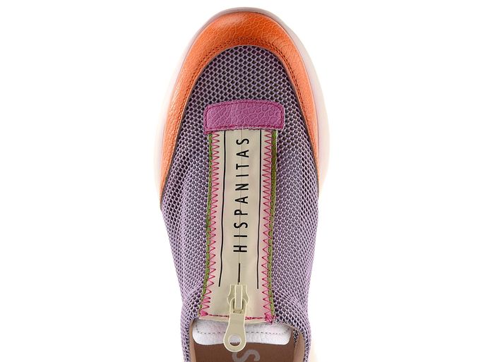 Sportovní styl s nádechem ženskosti je stále v módě. Dámské tenisky na vyšší klínové platformě od značky Hispanitas přinášejí lehkost a komfort. Svršek tvoří strukturovaná kůže a prodyšná síťovaná textilie, což zajišťuje prodyšnost a pohodlí. Nepřehlédnutelná barevná kombinace (fialová, oranžová, zelená, fuchsiová, béžová) dodává botám jedinečný vzhled. Funkční zip na nártu usnadňuje obouvání. Technologie TRIFLOW® poskytuje výjimečné odpružení díky třem polstrovaným vrstvám ve stélce, což zajišťuje pohodlí po celý den. Vyjímatelná stélka a lehká vyšší podešev zvyšují uživatelský komfort. Tyto tenisky jsou ideální volbou pro každodenní nošení ve městě.