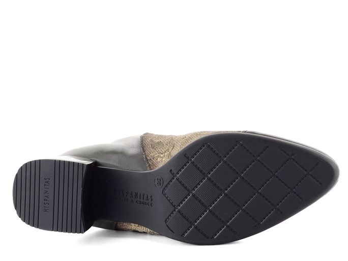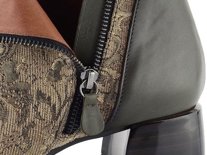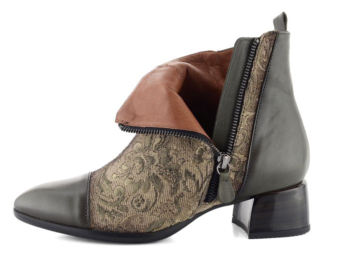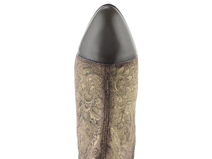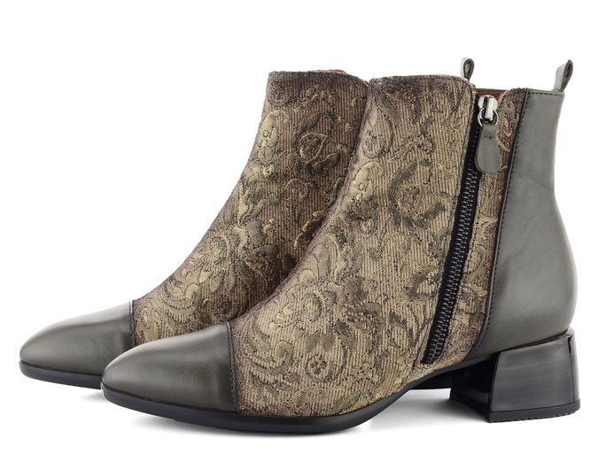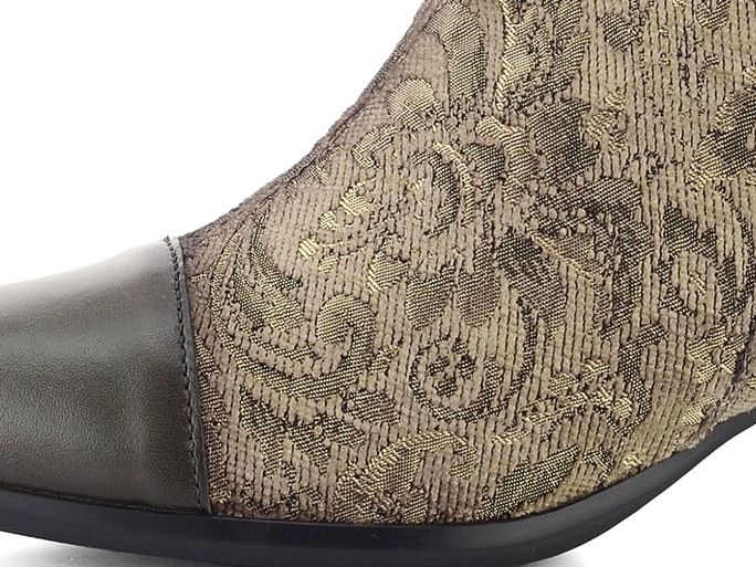 Luxusní dámský kotník v originálním pojetí, vyrobený z kombinace hladké kůže a brokátové textílie.