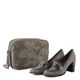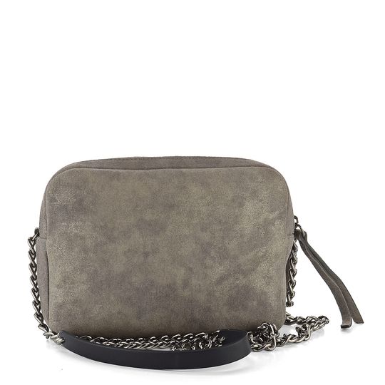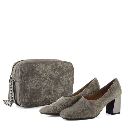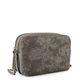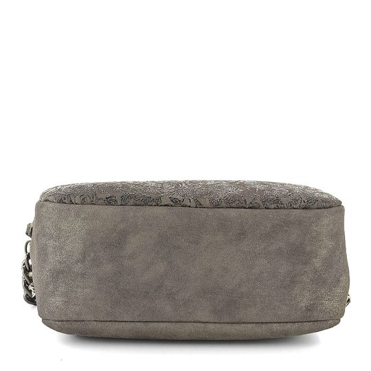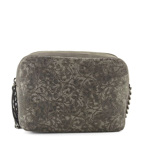 Dámská luxusní kožená crossbody kabelka v tmavší béžové barvě s brokátovým potiskem na přední straně.