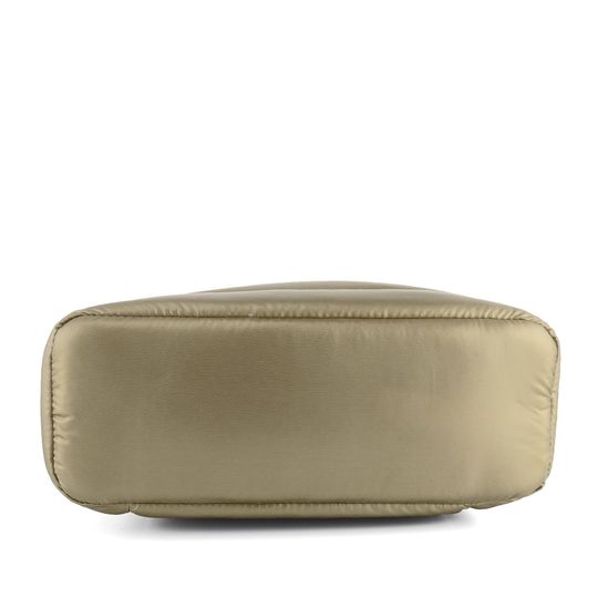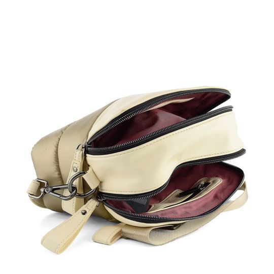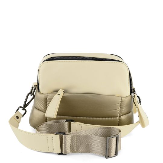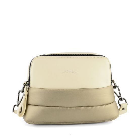 Stylová dámská crossbody kabelka ve sportovnějším stylu v kombinaci jemné syntetiky a lesklé prošívané textilie.