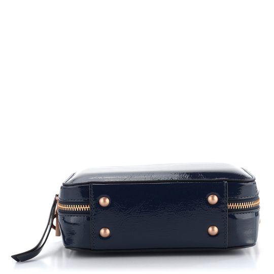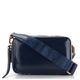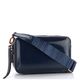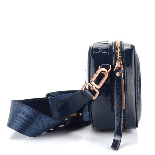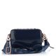 Jedinečná dámská crossbody kabelka menší velikosti, v temně modré barvě a lakovaném provedení.