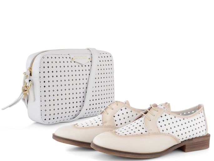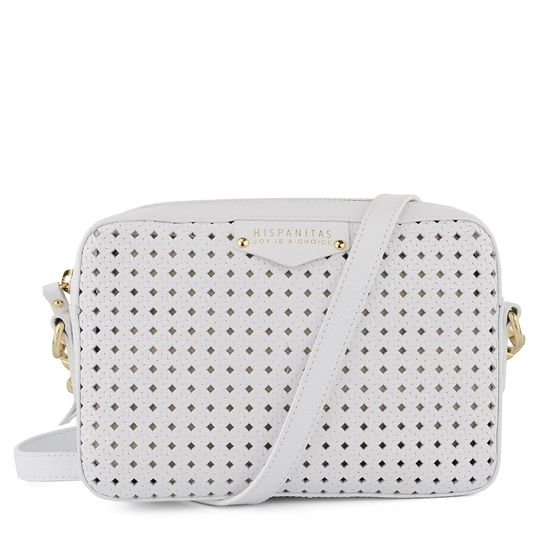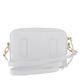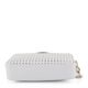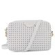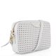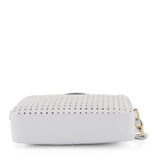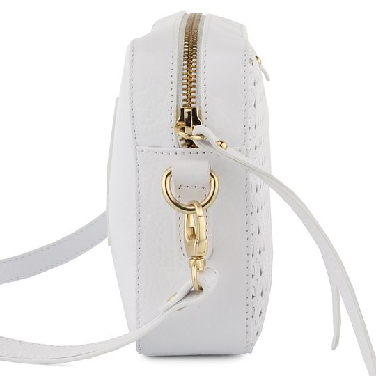 Dámská bílá crossbody kabelka s proplétaným vzorem, zlatým kováním a poutky pro přetvoření kabelky na ledvinku.