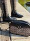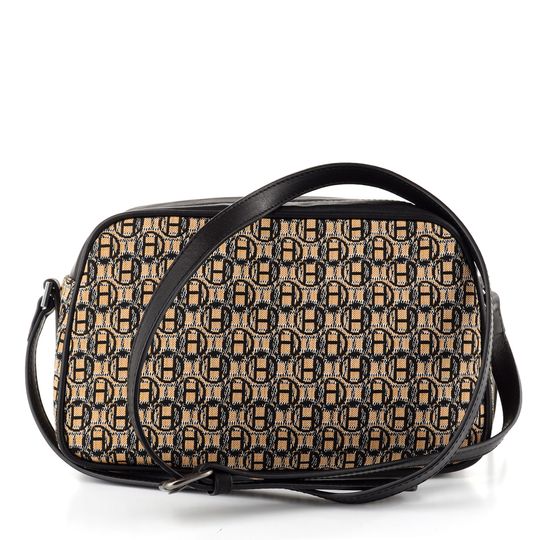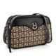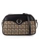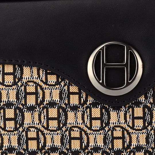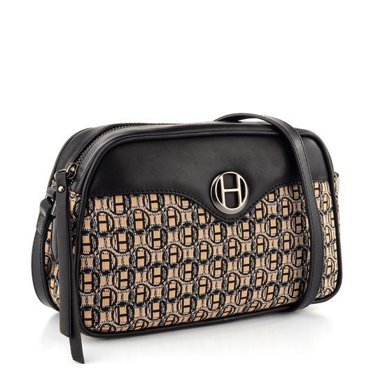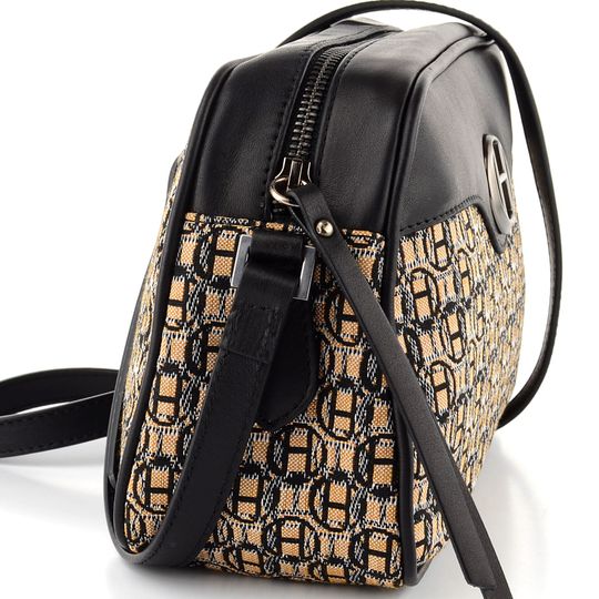 Luxusní černá dámská kabelka s módní vytkávanou textilní částí a kovovými doplňky ve stříbrné barvě.