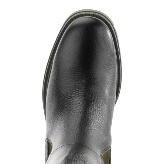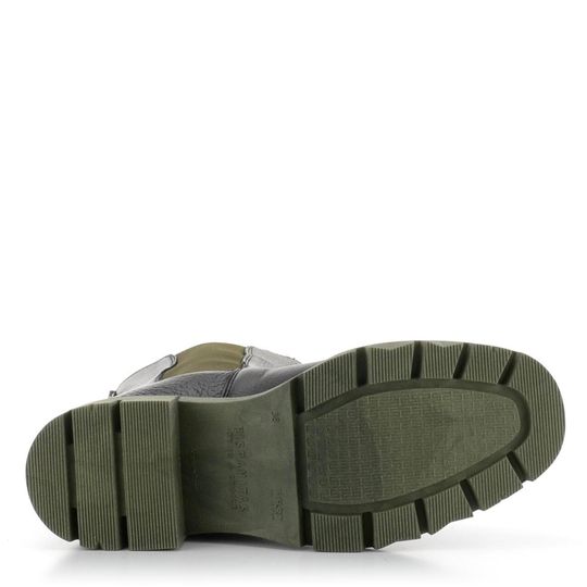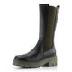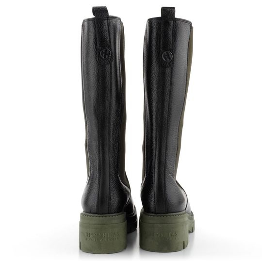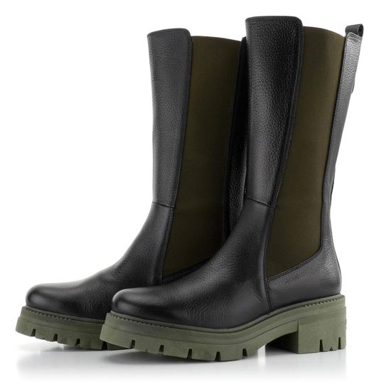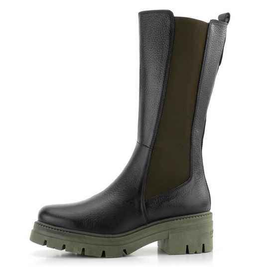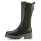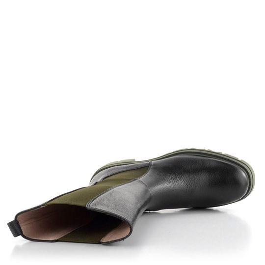 Trendové dámské polokozačky v černé barvě, se širokými pružinami a vysokou platformou v olivovém odstínu.