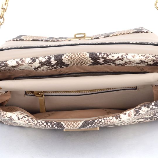 Nechte se unést elegancí a všestranností hadinkové klopnové kabelky od značky Hispanitas. Tato kabelka je ideální volbou pro každodenní nošení i slavnostní příležitosti díky svému sofistikovanému designu. Vyrobena z poddajné syntetiky s hadinkovou strukturou v béžových a šedých tónech, kabelka zaujme svým vzorem hadí kůže a bronzovým kováním. Praktické uspořádání interiéru nabízí dvě hlavní kapsy, z nichž jedna obsahuje zipovou kapsičku na cennosti. Odepínatelný ramenní pásek s řetízkem o délce 116 cm umožňuje pohodlné crossbody nošení. Rozměry: horní šíře 28 cm, spodní šíře 30 cm, výška 15 cm, hloubka dna 7 cm.