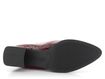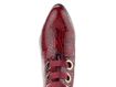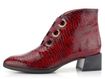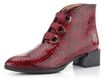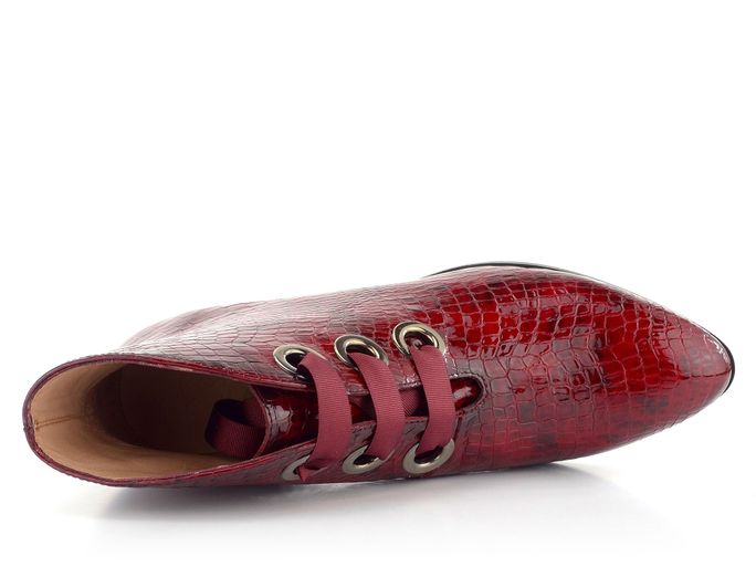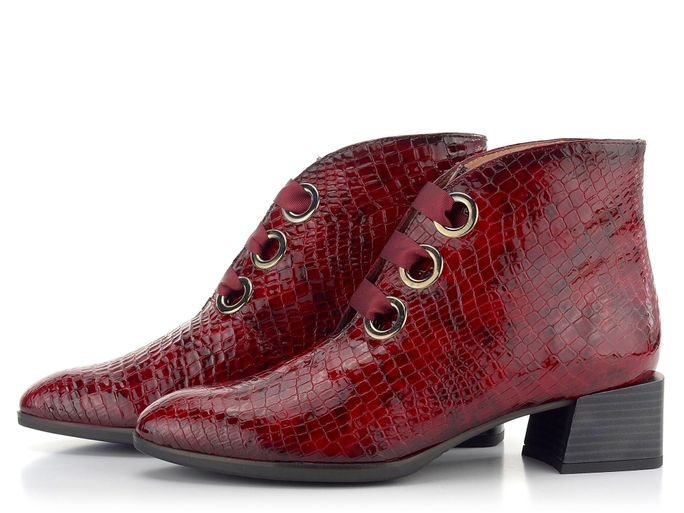 Luxusní dámské kotníkové boty značky Hispanitas v tmavě červeném odstínu jsou skvělou volbou pro podzimní a zimní sezónu. Svršek z lakované kůže s hadinkovým vzorem a elegantní špičkou zaručuje jedinečný vzhled. Boty mají třešňově červený odstín, který místy přechází až do vínové, a šněrování s módními kovovými oky a vínovou saténovou mašlí. Extra měkká stélka s technologií TRIFLOW® poskytuje komfort jako na gelovém polštářku. Celokožená podšívka a dekorativní podpatek v dekoru lakovaného dřeva dodávají botám na eleganci. Flexibilní podešev a výška podpatku 4,2 cm zajišťují pohodlí při každém kroku. Výška kotníku je 12 cm (bez podpatku). Tento model je vyroben lepeným způsobem, což zaručuje dlouhou životnost. Při nošení může dojít k přirozenému zvrásnění materiálu, což je typická vlastnost kůže.