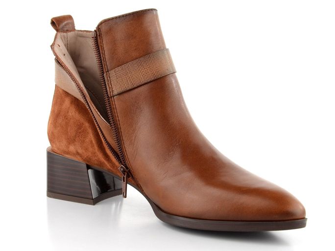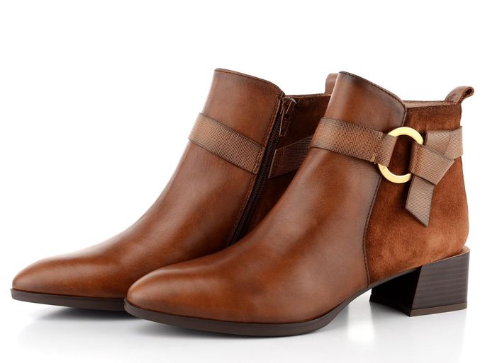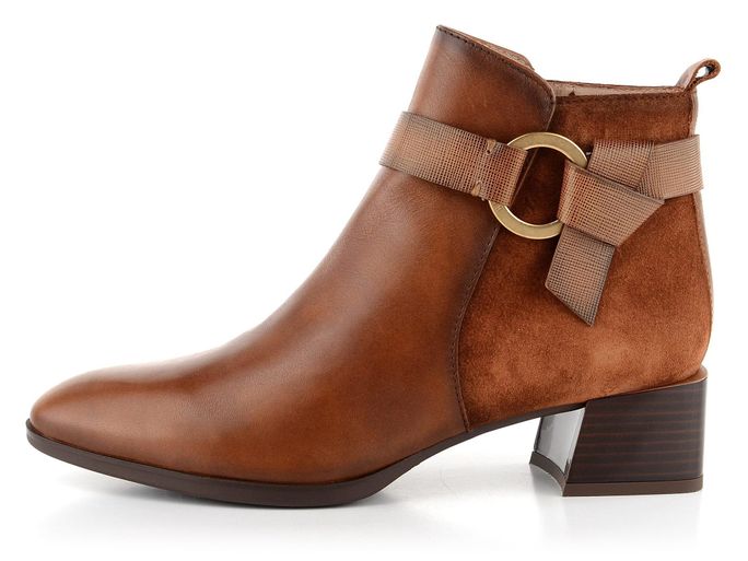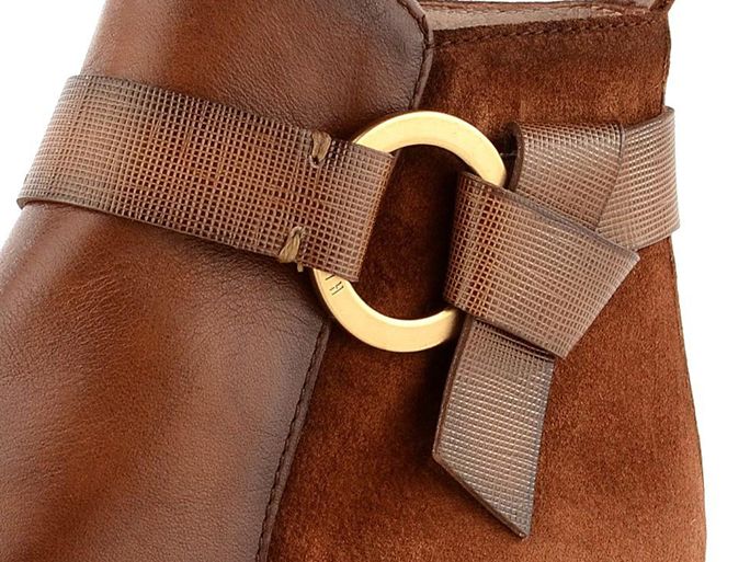 Dámský kotník z kombinace hladké a semišové kůže s kruhovou ozdobou přes kotník.