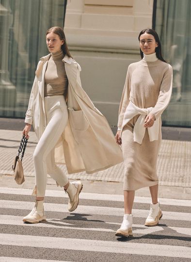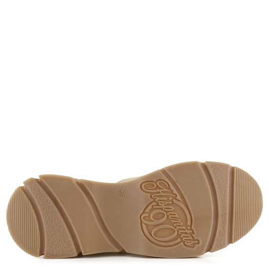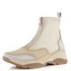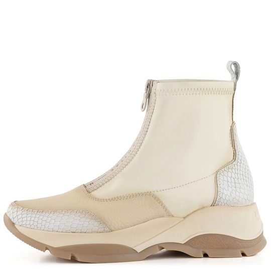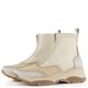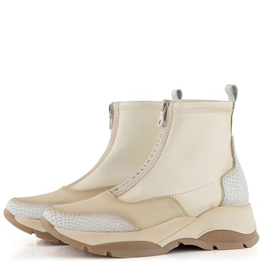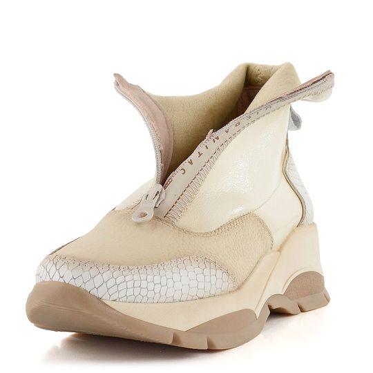 Luxusní dámský kotník na vyšší podešvi kombinovaný z různých materiálů ve světlých béžových tónech.