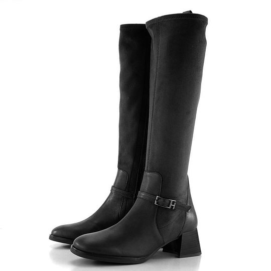 Elegantní dámské kozačky na podpatku od značky Hispanitas vás nadchnou svým designem a komfortem. Kozačky mají kulatou špičku a jsou vyrobeny z kombinace hladké kůže a pružné textílie, což zaručuje jejich dlouhou životnost a pohodlí. Černá barva je univerzální a snadno se kombinuje s různými outfity. Kozačky jsou zdobené páskem s kovovou aplikací ve stříbrné barvě, což jim dodává nádech luxusu. Funkční zip na vnitřní straně usnadňuje obutí, zatímco strečový materiál dokonale obepne lýtko. Měkká stélka s technologií TRIFLOW® poskytuje chůzi jako na gelovém polštářku. Horní vnější obvod kozačky bez napnutí měří 36 cm (pro vel.38), což je ideální pro užší až standardní typ lýtka. Výška obuvi je 41,5 cm (bez podpatku) a pohodlný 5 cm vysoký podpatek zajišťuje stabilitu. Latexová podešev a lepený výrobní způsob zaručují maximální pohodlí a odolnost.