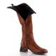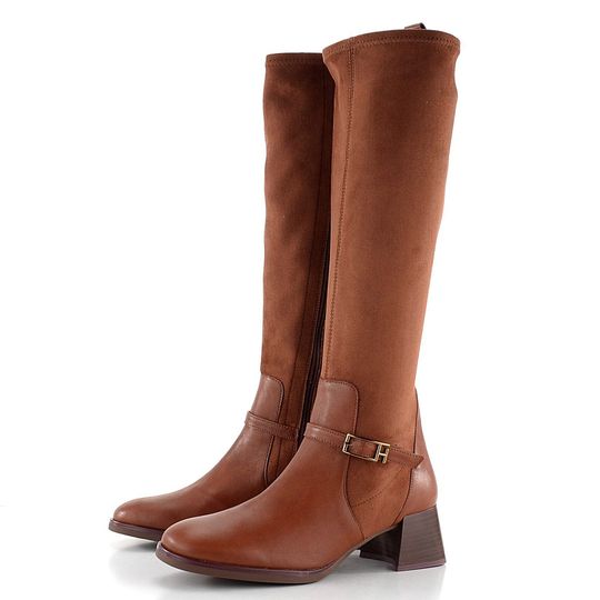 Luxusní dámské kozačky na podpatku, vyrobené z prémiové kůže a pružné broušené textilie v lýtkové části.
