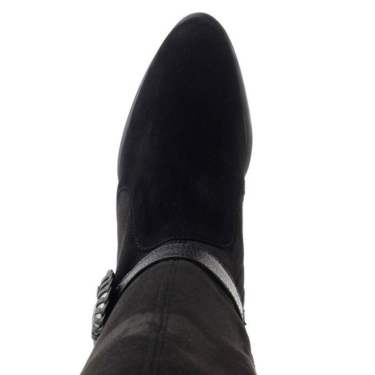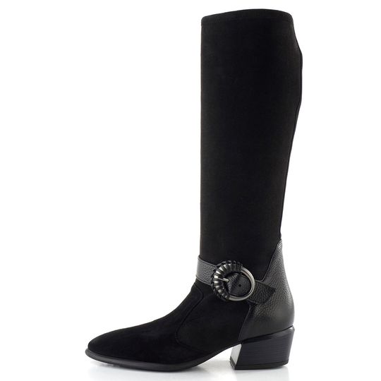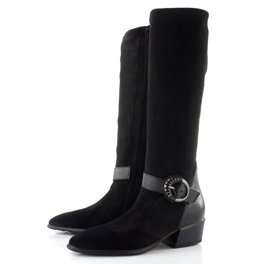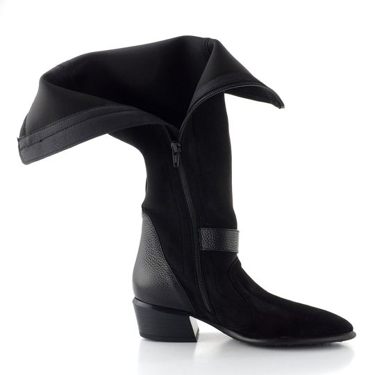 Luxusní nevyteplené dámské kozačky na podpatku, vyrobené z pružné broušené textilie s koženou špičkou a patou.