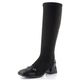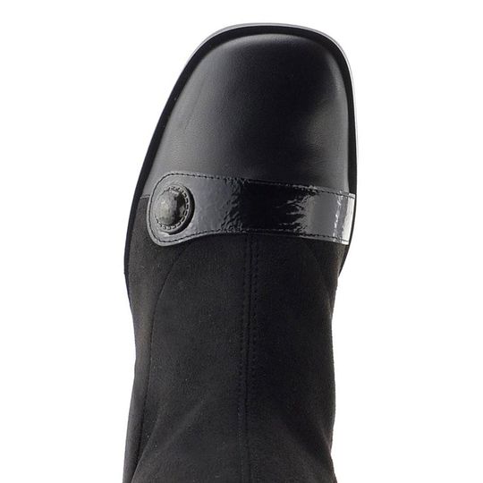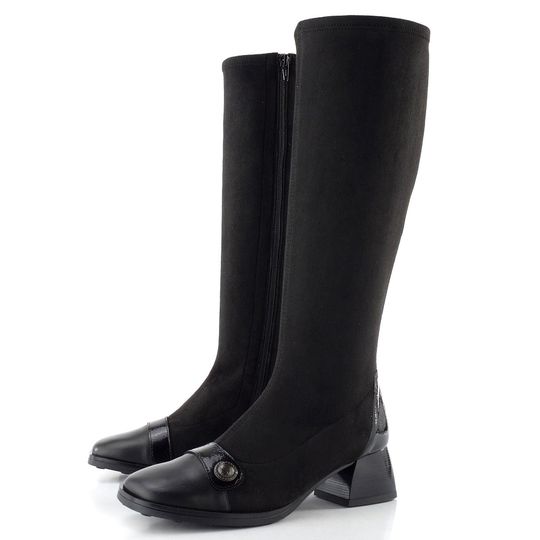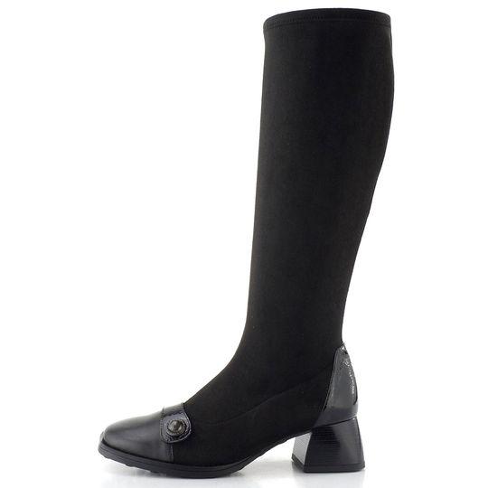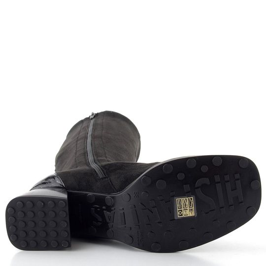 Elegantní dámské kozačky Hispanitas s pružným lýtkem jsou ideální volbou pro podzimní a zimní dny. Jejich černá barva a kombinace hladké a lakované kůže dodávají sofistikovaný vzhled, zatímco prostorná hranatější špička zajišťuje pohodlí při nošení. Funkční zip na vnitřní straně usnadňuje obutí, a strečový materiál dokonale obepne lýtko, což oceníte při každém kroku. Kozačky jsou vybaveny měkkou stélkou s technologií TRIFLOW®, která poskytuje pocit chůze jako na gelovém polštářku. S výškou obuvi 39 cm a pohodlným podpatkem 5 cm se hodí jak do kanceláře, tak na formální příležitosti. Vhodné pro standardní až mírně širší typ lýtka M/L, tyto kozačky se stanou vaším oblíbeným kouskem.