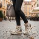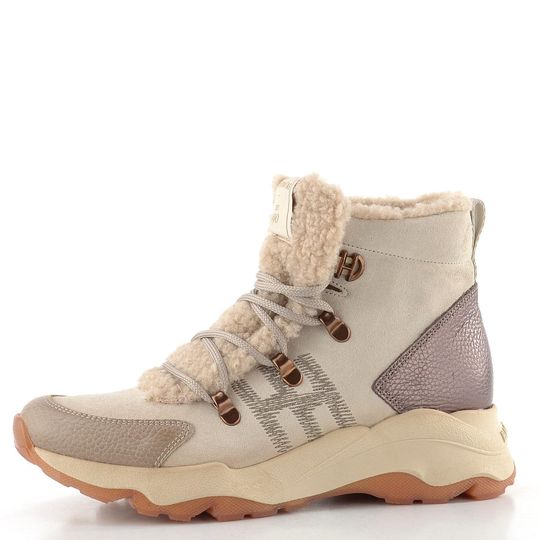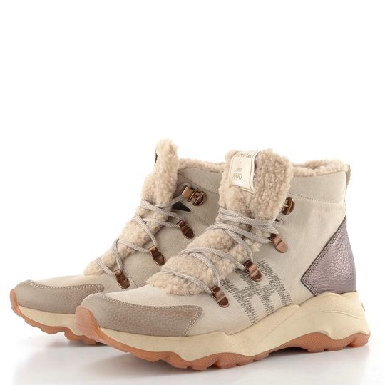 Dámský nezateplený kotník od španělské značky Hispanitas kombinuje styl a pohodlí na sportovní platformě. Tento model v béžové barvě s šedohnědým metalickým doplňkem dodá vašemu outfitu elegantní nádech. Svršek z velurové, strukturované a metalické kůže v kombinaci s beránkovou textilií zajišťuje nejen atraktivní vzhled, ale i komfort při nošení.