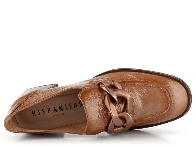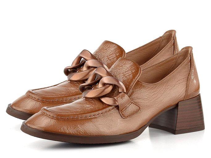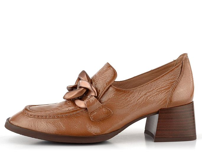 Exkluzivní dámské polobotky z lakované kůže v krásné, mandlově hnědé barvě, se zdobeným nártem a pohodlným podpatkem.