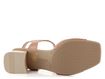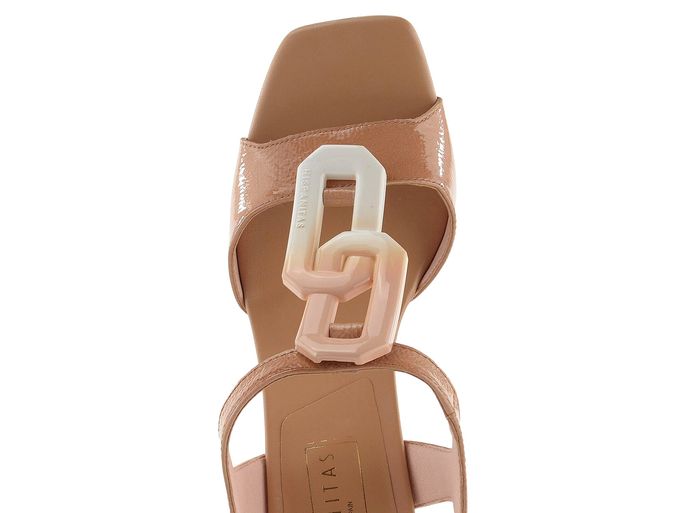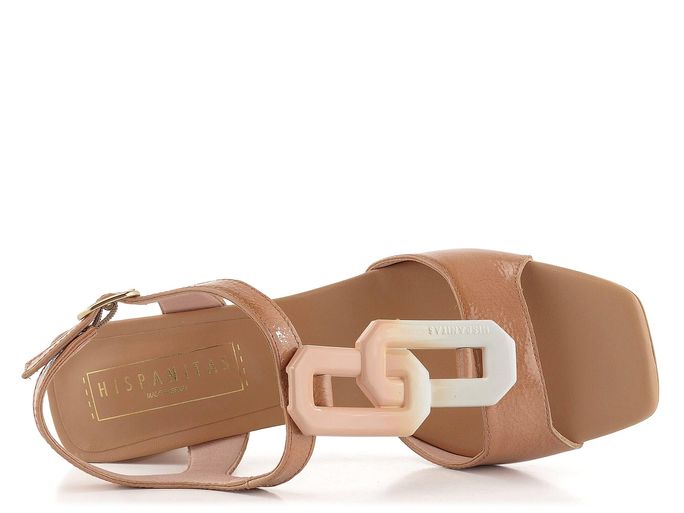 Luxusní dámské sandály od značky Hispanitas jsou ideální volbou pro jarní a letní sezónu. Tyto elegantní páskové boty vynikají trendovým karé střihem a stínovaným béžovým odstínem (desert), který dodává každému outfitu sofistikovaný nádech. Sandály jsou vyrobeny z lakované kůže a zdobeny lakovanou sponou na špičce, která přechází z bílé do béžové barvy. Pásek kolem nohy je vybaven pruženkou, jež umožňuje délkovou regulaci pro maximální pohodlí. Technologie TRIFLOW® s třemi polstrovanými vrstvami ve stélce a podešvi zajišťuje výjimečné odpružení, což poskytuje komfort po celý den. Stélka je potažena hladkou kůží a tvarovaný podpatek vysoký 5,5 cm dokonale ladí se sponou. Latexová podešev a lepený výrobní způsob garantují dlouhou životnost a trvalou kvalitu. Tyto sandály jsou perfektní volbou do města, kanceláře i na lehkou procházku.