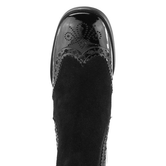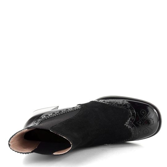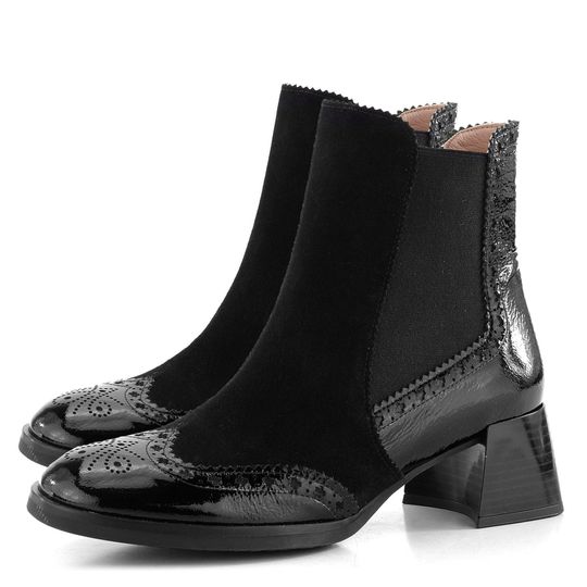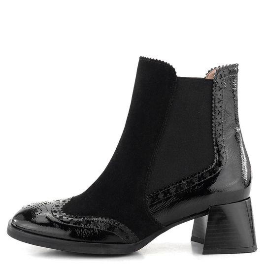 Elegantní dámské kotníkové boty od značky Hispanitas kombinují lakovanou a semišovou kůži, což jim dodává jedinečný vzhled. V černé barvě s ozdobným prořezáváním na lemech a špičce se stanou stylovým doplňkem vašeho šatníku. Boty mají pohodlný střih s kulatou špičkou a všité široké pružné vsadky, které usnadňují obutí a zajišťují komfort při chůzi.