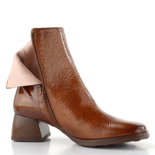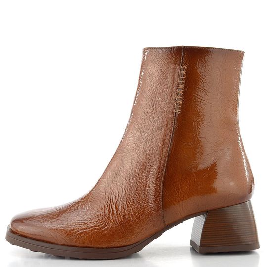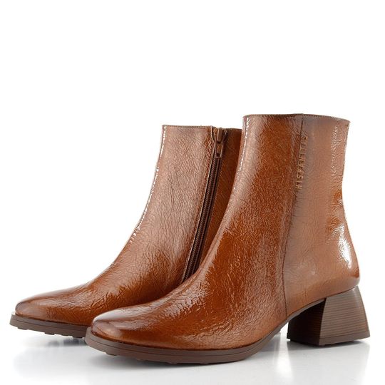Luxusní dámský kotníček od značky Hispanitas je ideální volbou pro podzimní a zimní sezónu. Jeho prostorová hranatější špička a mačkaná lakovaná kůže v přírodním hnědém odstínu s měděným nádechem dodávají elegantní vzhled. Pro snadné obutí je na vnitřní straně umístěn zip, zatímco decentní plastický název značky na vnější straně podtrhuje jeho styl.
