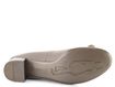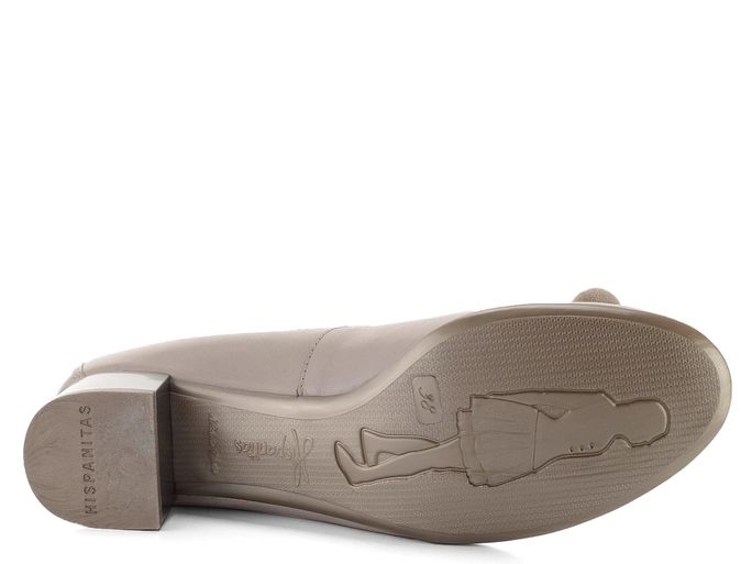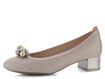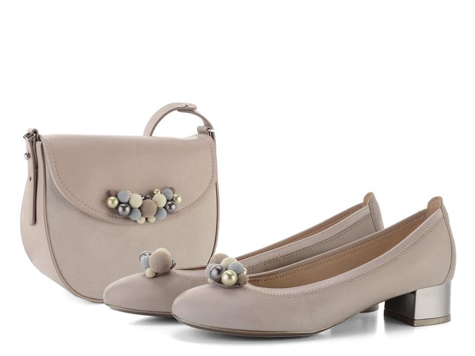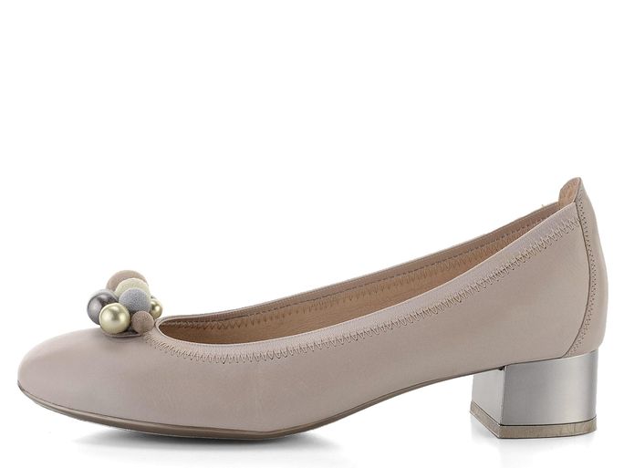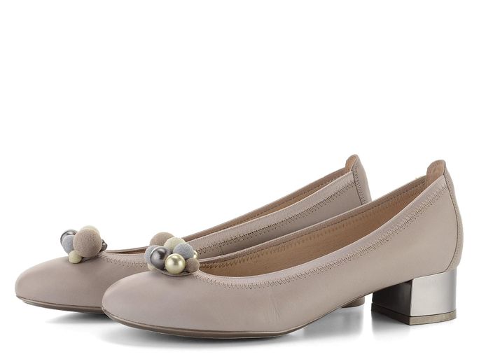 Luxusní dámské lodičky z hladké kůže v béžové barvě s trendovými bambulkami a na nižším metalickém podpatku.