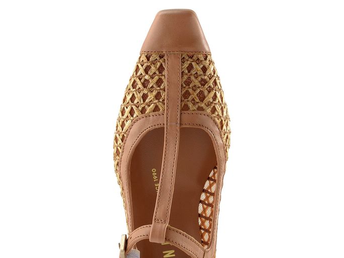 Luxusní dámské lodičky z hladké kůže a splétaného lýka, s elegantní úzkou špičkou, nízkým podpatkem a nártovým páskem.