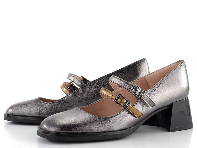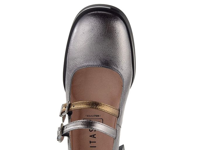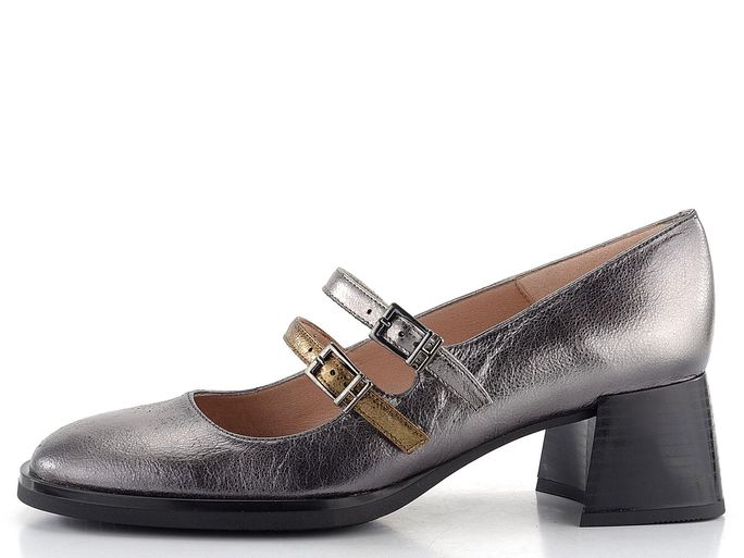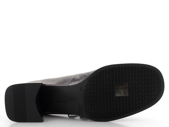 Nová kolekce značky Hispanitas přináší elegantní dámské lodičky v metalickém provedení s nártovými pásky. Tyto boty zaujmou prostorným kulatým střihem a jemně strukturovanou metalickou kůží ve tmavší, ocelově šedé barvě, doplněnou páskem v barvě starého zlata. Nártové pásky jsou našité na pružence a umožňují délkovou regulaci, což zajišťuje pohodlné nošení. Uvnitř najdete odolnou a ekologickou (vegan) podšívku z umělého mikrovlákna s termoregulační funkcí, která poskytuje extra komfort. Měkká stélka s technologií TRIFLOW® nabízí výjimečné odpružení pro celodenní pohodlí. Pohodlný široký podpatek o výšce 5 cm a latexová podešev s hrubším vzorkem zaručují stabilitu a bezpečnost při chůzi. Lepený výrobní způsob přináší trvalou kvalitu. Tyto lodičky jsou ideální volbou pro podzimní a zimní sezónu, ať už do kanceláře nebo na formální příležitosti.