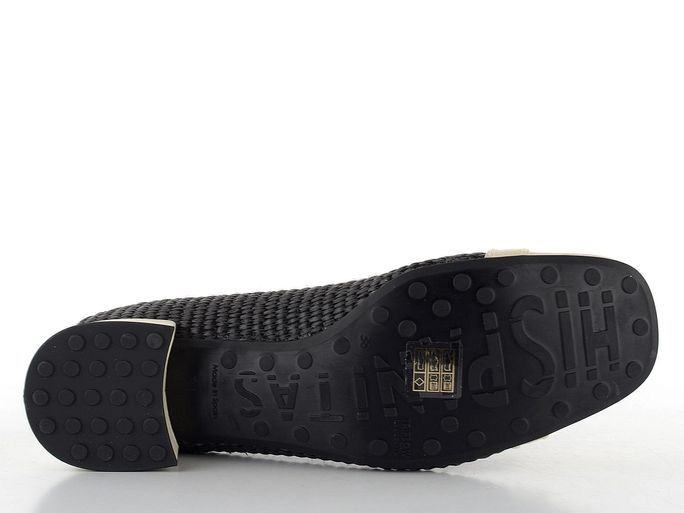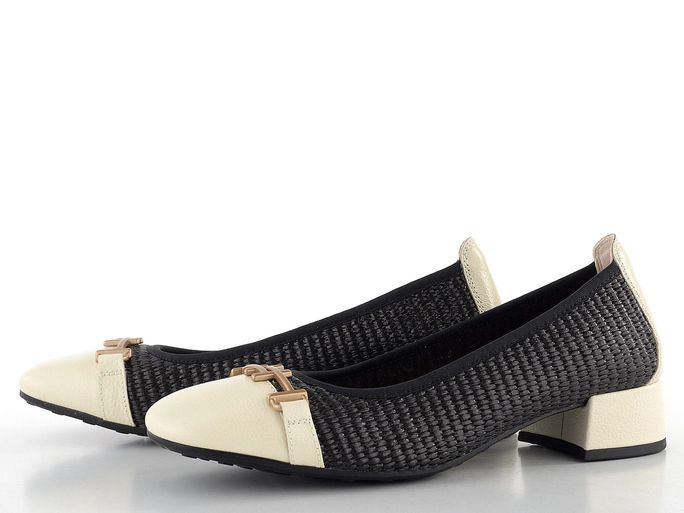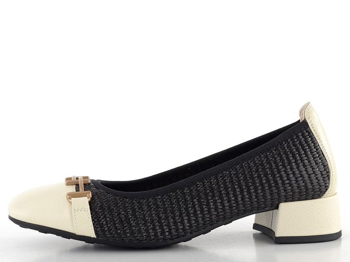 Pokud hledáte eleganci a komfort v jednom, lodičky značky Hispanitas jsou tou pravou volbou. Tyto dámské lodičky vynikají osobitým designem v černo-bílé kombinaci, který zaujme na první pohled. Díky karé špičce a pružence v obvodu se dokonale přizpůsobí vaší noze a zajistí pohodlné nošení po celý den. Svršek je vyroben z kvalitní strukturované kůže a umělého lýka, což zaručuje dlouhou životnost obuvi. Hladká kožená stélka s technologií TRIFLOW nabízí měkkou chůzi díky třem polstrovaným vrstvám. Stabilní podpatek o výšce 3,5 cm je potažen kůží, což přidává na luxusním vzhledu. Flexibilní latexová podešev pak poskytuje dokonalou oporu a stabilitu při každém kroku.