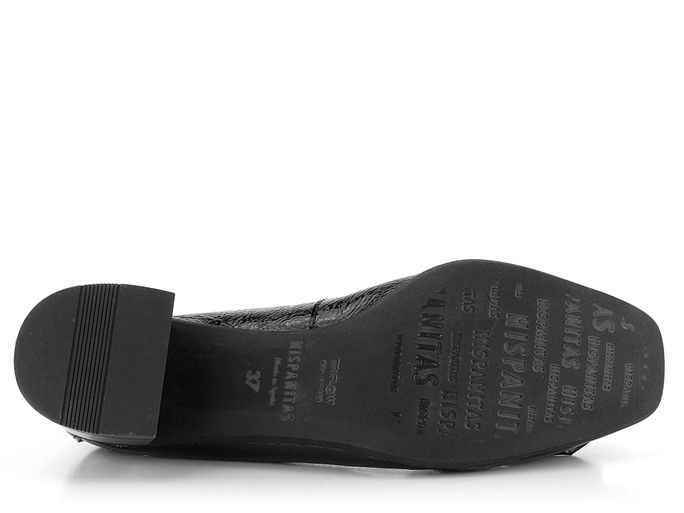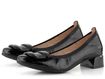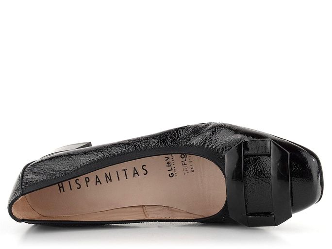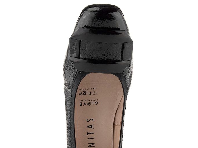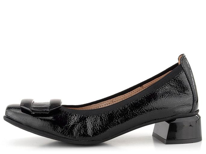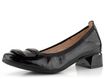 Dámské nevšední lodičky z lakované kůže v černé barvě, doplněné velkou sponou na špičce a lesklým podpatkem.