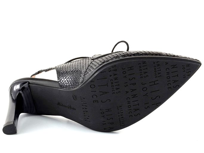 Elegantní dámské lodičky značky Hispanitas v nadčasové černé barvě, vyrobené z hadinkové kůže, se stanou vaším nepostradatelným doplňkem pro každou příležitost. Špičatý tvar a moderní šněrování na nártu dodávají botám výrazný ženský vzhled. Díky celokožené podšívce a lehce vyměkčené stélce poskytují lodičky maximální komfort. Patní pásek je pružný, což zajišťuje perfektní usazení na noze. Zajímavě tvarovaný podpatek s výškou 9 cm v lakované úpravě dodává botám jedinečný styl. Tyto lodičky jsou ideální volbou pro jarní a letní sezónu, ať už do kanceláře, na formální akce či lehčí procházky městem. Vybírejte kvalitu a styl s obuví značky Hispanitas.