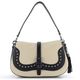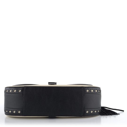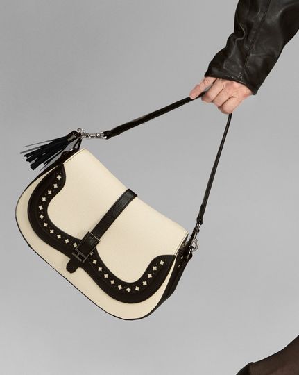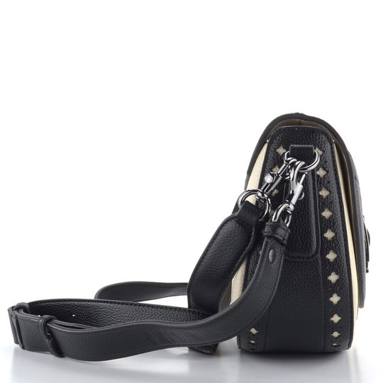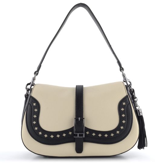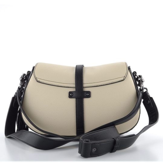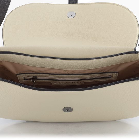 Luxusní kabelka značky Hispanitas v kombinaci světle béžové a černé barvy je symbolem elegance a originality. Kabelka je vyrobena ze strukturované syntetiky a zdobí ji ozdobné prořezávání, které lemují její kontury. Díky odepínatelnému střapci a klopě s magnetickým zapínáním (spona je dekorativní) je nejen stylová, ale i praktická. Vnitřní výbava zahrnuje zipovou kapsičku na cennosti a otevřenou kapsičku na mobil. Součástí jsou dva odepínatelné popruhy – kratší přes rameno a délkově nastavitelný crossbody popruh (120 cm ± 7 cm). Kabelka má rozměry: výška 19 cm, střední šířka 30 cm a hloubka 9 cm. Tato kabelka z podzimní/zimní kolekce 2024/25 je ideálním doplňkem pro každodenní nošení i formální příležitosti.