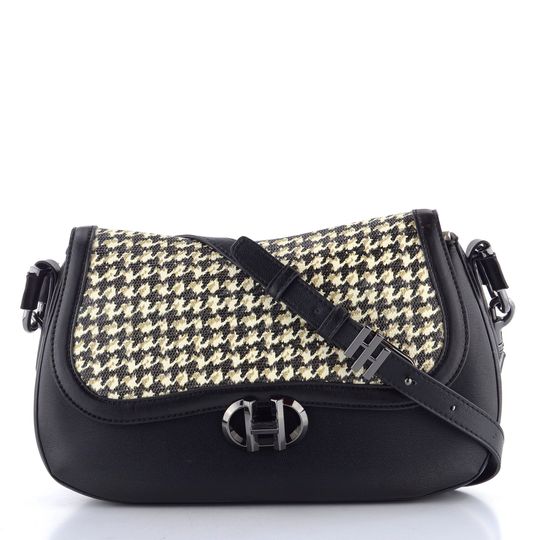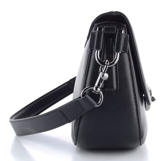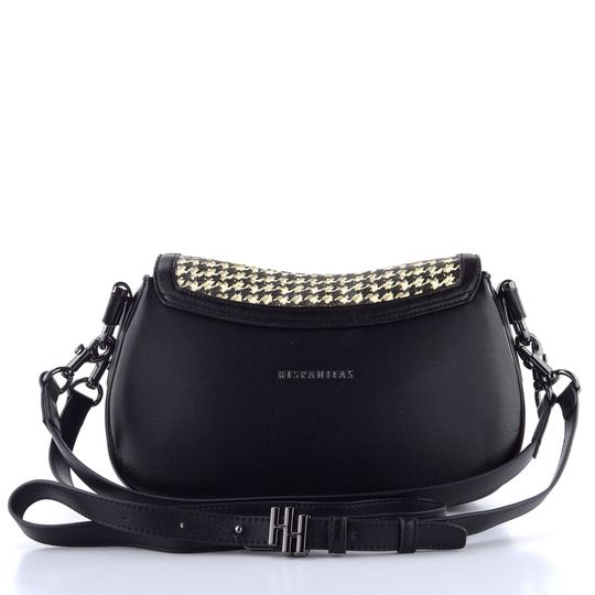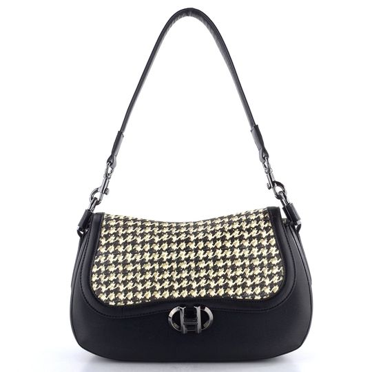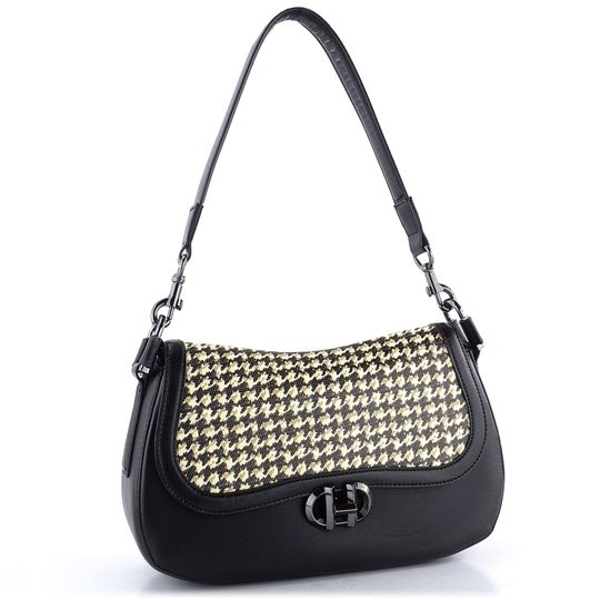 Luxusní kabelka v černé barvě se vzorovanou klopou a se dvěma odepínatelnými popruhy.