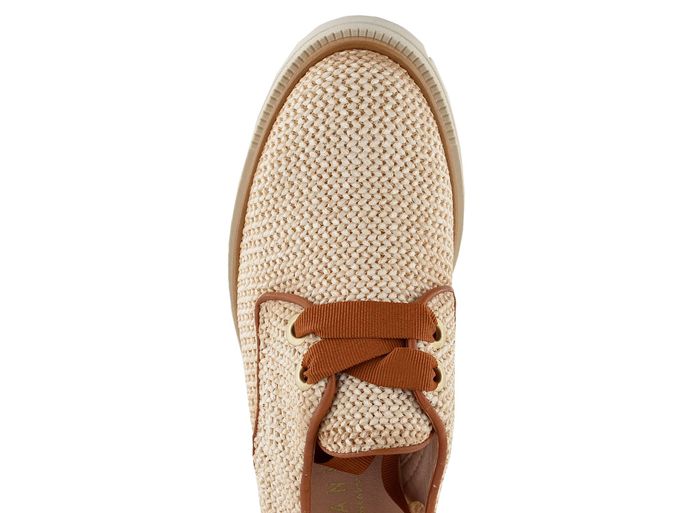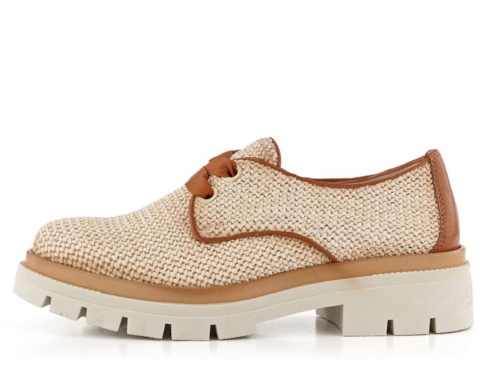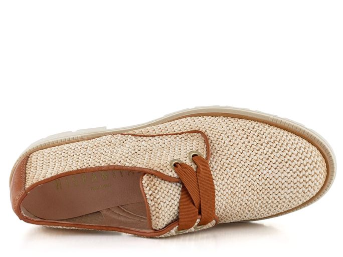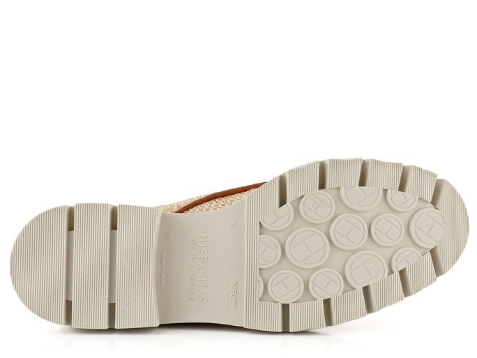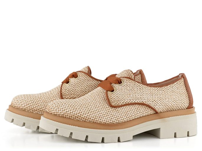 Letní dámské polobotky v derbovém střihu od značky Hispanitas kombinují elegantní design a vysokou kvalitu. Tyto polobotky jsou vyrobené z proplétaného lýkového materiálu, který je doplněn patním dílcem a paspulky z hladké kůže. Béžový odstín s jemným stínováním a přírodní hnědou barvou dodává botám jedinečný vzhled.
