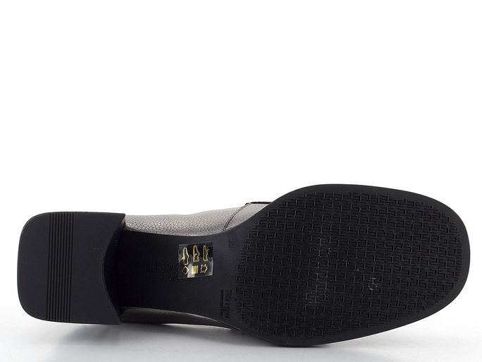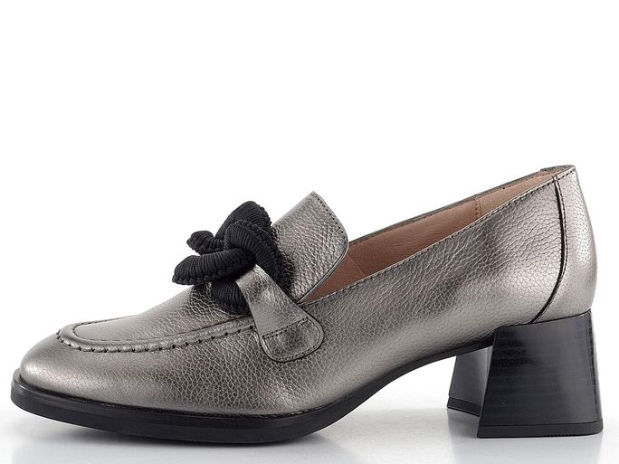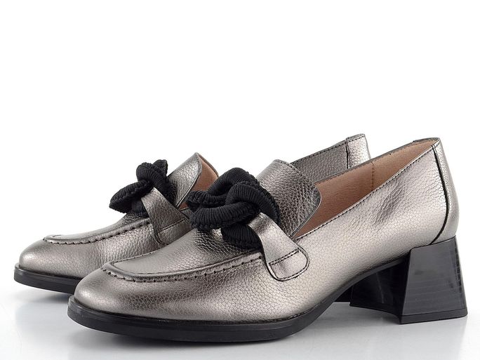 Exkluzivní dámské polobotky z metalické kůže v ocelově šedé barvě, se zdobeným nártem a pohodlným podpatkem.