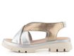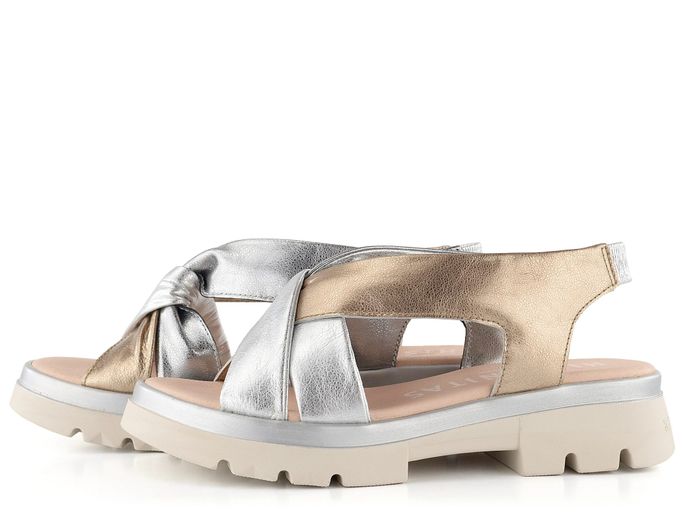 Dámské kožené sandály v metalickém odstínu stříbrné a zlaté barvy, na pohodlné, robustní podešvi.